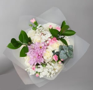 A hand-tied bouquet of twelve premium white roses, accented with soft lilac and pink spray flowers and delicate white blooms, eucalyptus and lush greenery. Housed in elegant light wrapping Oops! I’m Rosy enchants with its luxurious fragrance and playful, dreamy charm – a bouquet that is as tender and blushing as its name.