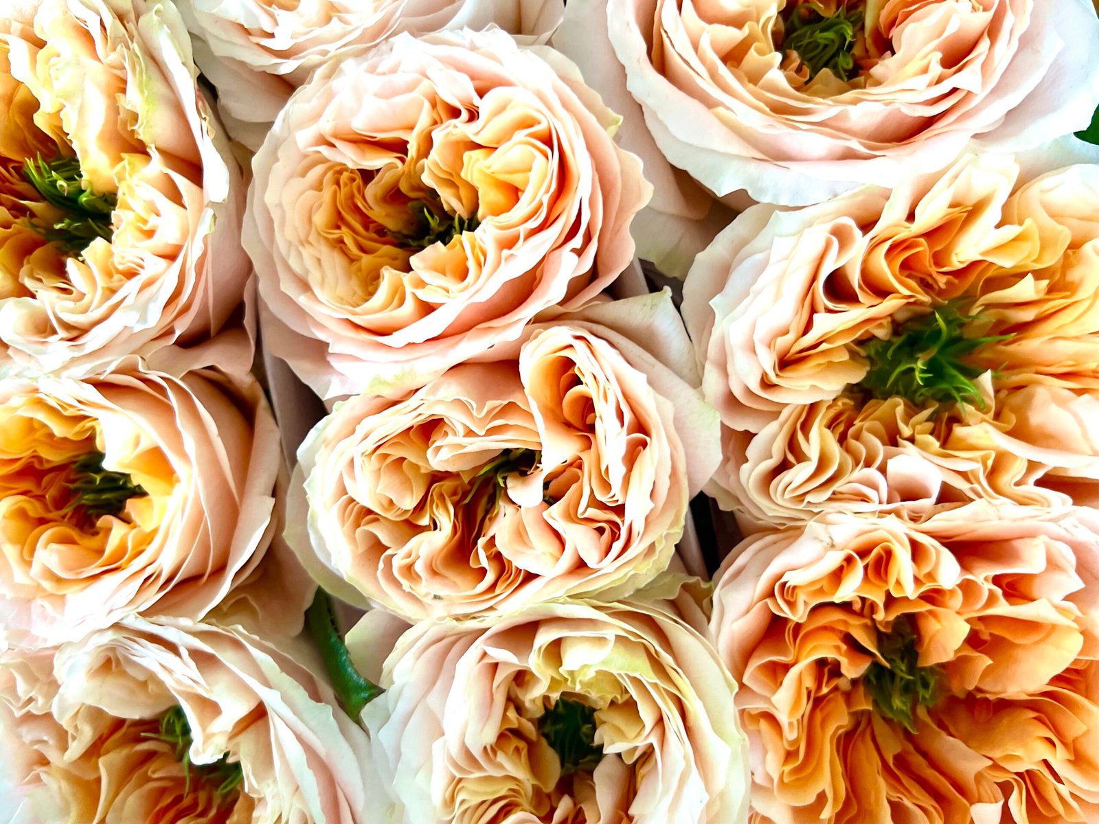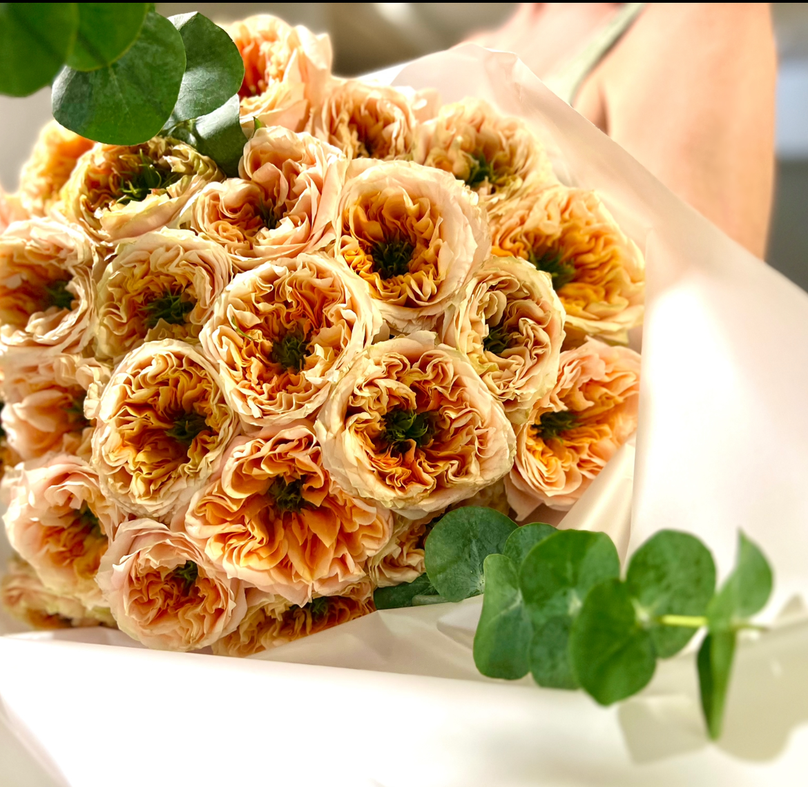 Each rose has deep layered petals that unfold like silk — creating that couture, ruffled texture only premium garden roses can give. The center glows with warm tones of apricot, caramel and golden peach… feminine, elegant and irresistibly luxurious.